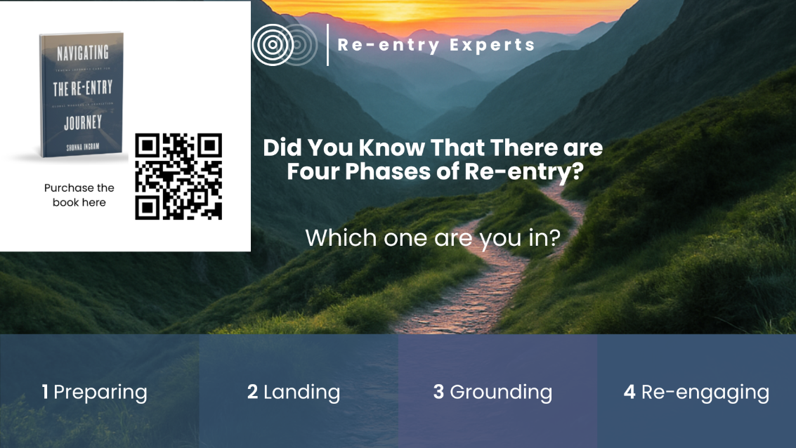 We’ve developed a framework to help you navigate each phase of the journey. Having worked with hundreds of people in this season. We have seen similar patterns. We narrow down the important accepts of the Re-entry Seaso into four key phases: Preparing, Landing, Grounding and Re-engaging. This long-term strategy ensures you receive the support you need at every step.